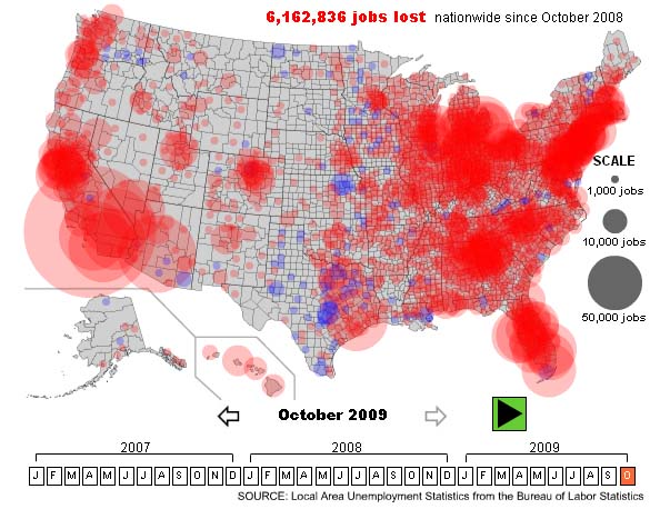Slate has taken the Local Area Unemployment Statistics from the U.S. Bureau of Labor Statistics to create an information visualization showing the jobs lost over the past two years. Blue circles indicate that jobs were gained. Red circles indicate that jobs were lost. The size of the circle indicates the magnitude of change. The visualization is interactive. It allows you to either play through the timeline, or you can click on a certain month to see the data. The problem with such visualizations is that entire states disappear from view under the data. I personally prefer the way Flowing Data used the counties in their visualization instead of using circles. Unfortunately, Flowing Data’s visualization is not interactive like Slate’s.