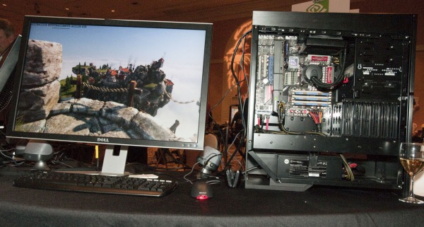 [H]ard|OCP has an editorial today with some information about Nvidia’s 3D Surround multi-display gaming setup at CES. Nvidia has its 3D Surround technology running on a pair of 285 GTX graphics cards in the lobby. This is being displayed on three projectors at 720P and is using VGA connectors. In the booth, they have a pair of 285 GTX graphics cards running across three 1920×1080 displays using three dual-link DVI connectors. It is great to see the technology available to current generation graphics cards. Nvidia also has its 3D Surround technology running on a pair of GF100s graphics cards in the booth. This too is being displayed on three projectors at 720P and is using VGA connectors.