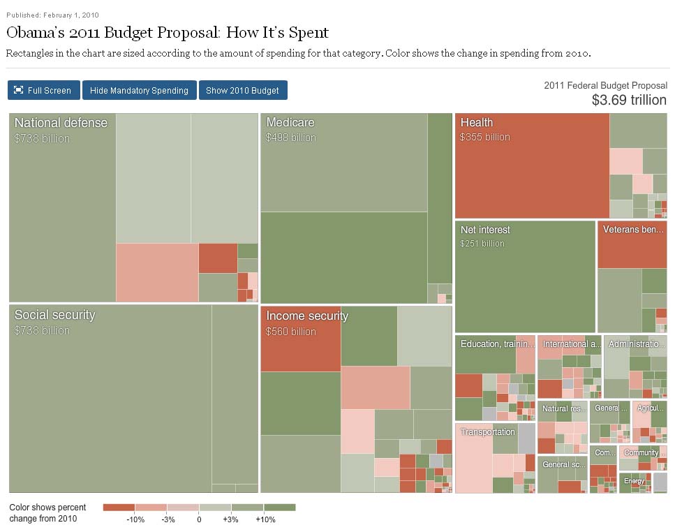 The New York Times has two great infographics. The first takes a look at Obama’s Budget Proposal, and shows you where the money is spent. Both National Defense and Social Security tie with $738 Billion being spent on them. Income security comes in third at $560 Billion. Income Security includes such items as unemployment insurance, food stamps, etc. Medicare comes in fourth at $498 Billion. The infographic is interactive, and allows you to delve into particular areas of the budget to learn more about it. It is also colored to show whether the budget increased in a particular area, or decreased.