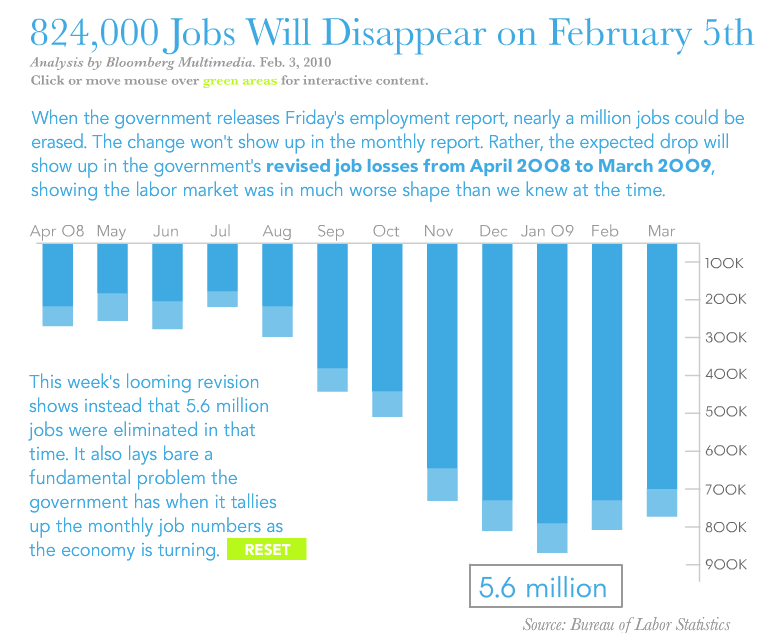 Bloomberg has an interactive graphic showing that more jobs were lost during the recession than was previously thought. Every month the government releases unemployment numbers. In those numbers are a estimate of the number of jobs created and number of jobs lost. This is called the Birth/Death model. The Birth/Death model for all of 2009, with the exception of January’s numbers, showed jobs being created even during the middle of a recession. The January unemployment report, which will be released on Friday at 7:30 EST, will contain revisions to the Birth/Death model. This revision is not unexpected since it happens every year. For the past six months, the U.S. government has been saying that they will have to revise the numbers with 824,000 jobs being lost.
